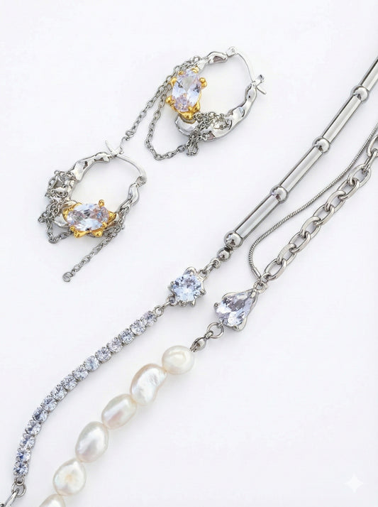 SWEEKU - Asymmetrical Pearl + Zirconia Necklace