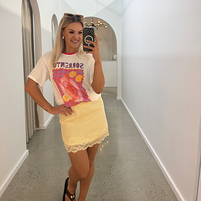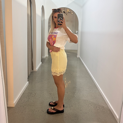 Soft, light and just the right amount of feminine — the By Frankie Butter Lace Trim Skirt is made for easy days and golden moments. With its buttery hue, delicate lace hem and breathable cotton lining, it’s the perfect mix of comfort and charm. Pair it with a tee or a crisp shirt and let it do the rest.