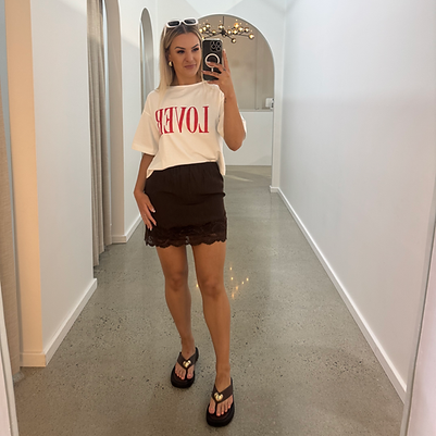A little bit sweet, a little bit sultry — this chocolate lace trim skirt from By Frankie is one of those pieces that just feels good to wear. The soft cotton lining keeps it comfortable, while the lace hem adds that extra touch of charm. Easy to style up or down, it’s one you’ll reach for again and again.