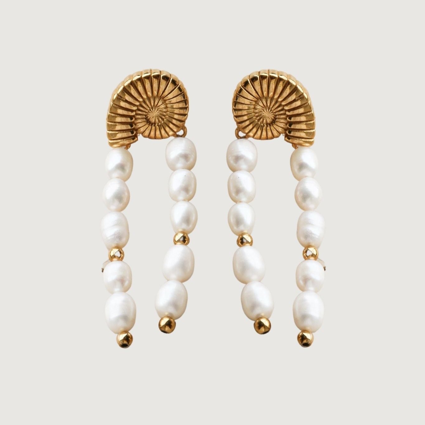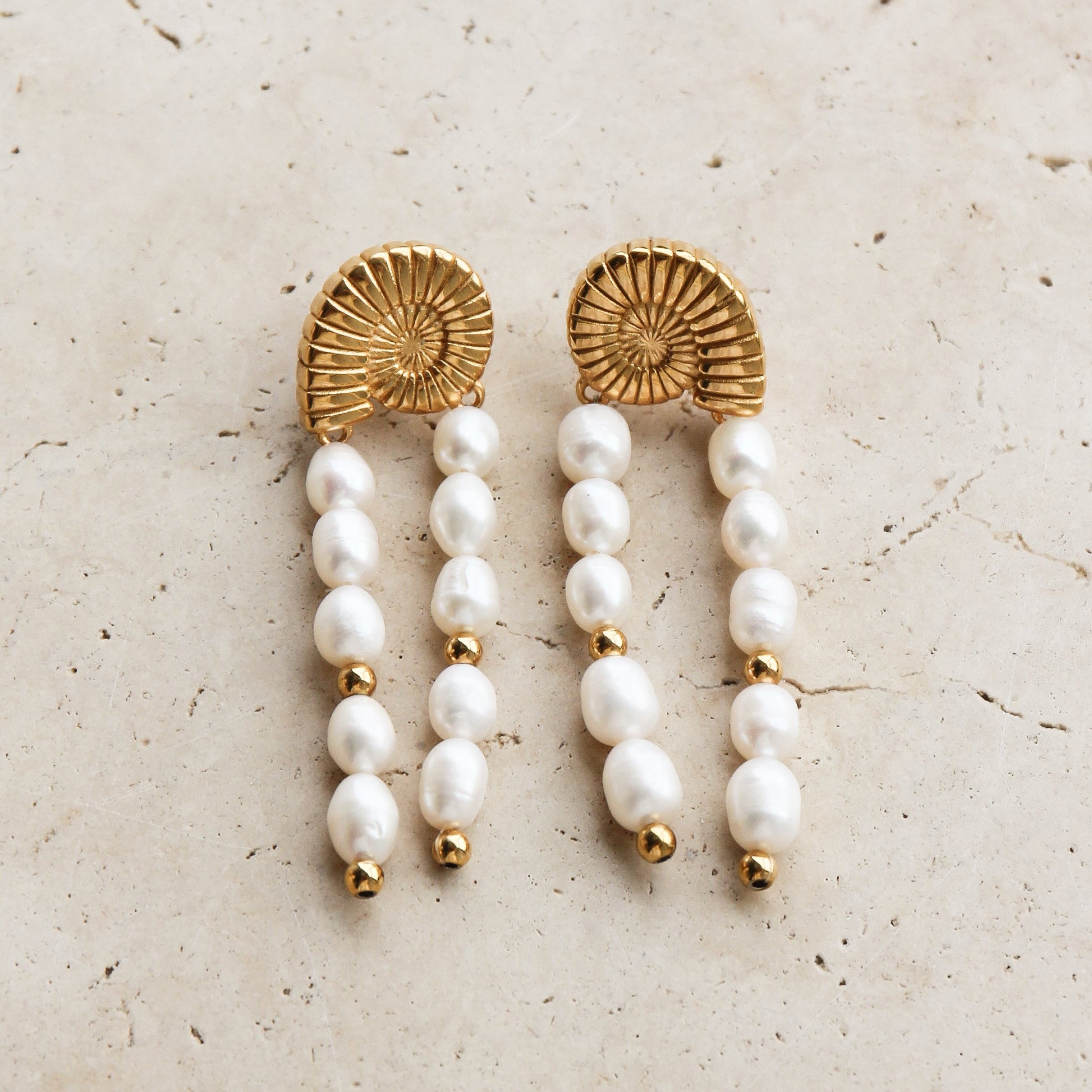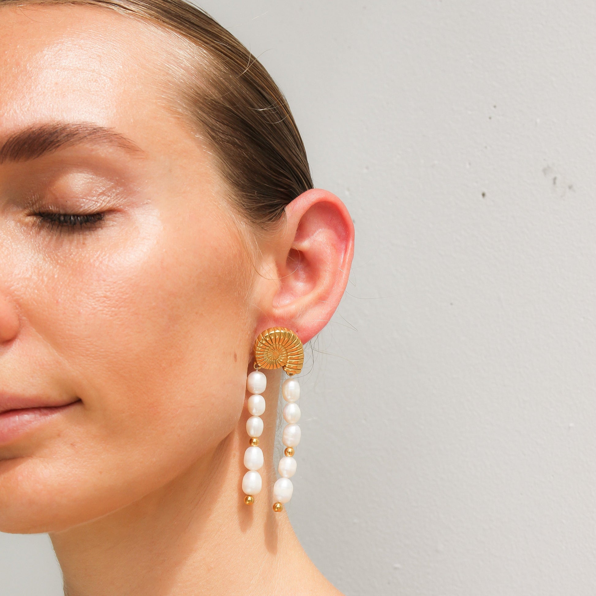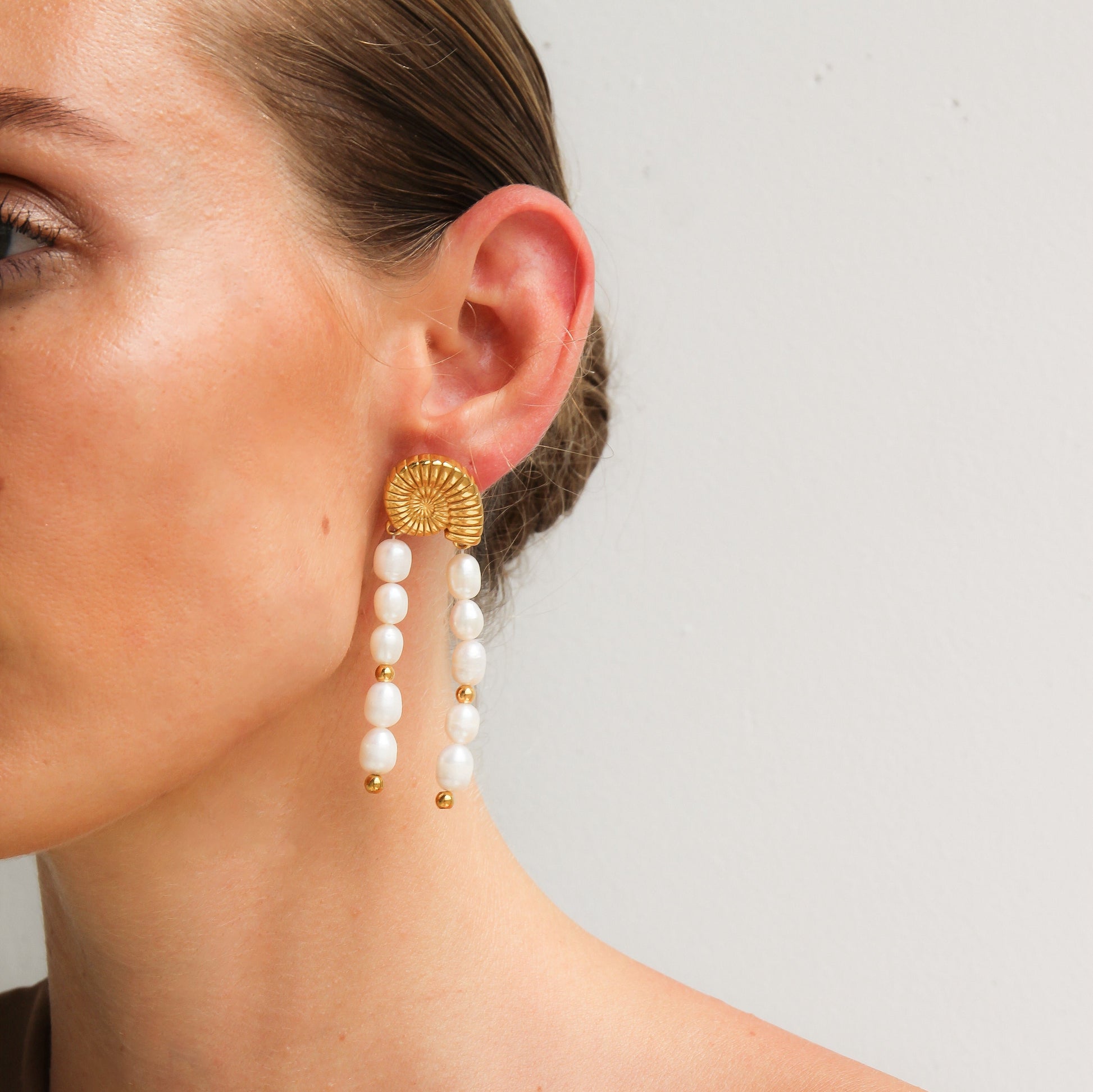 Tegan Rae - Conch Shell Pearl Drop Tassel Earrings