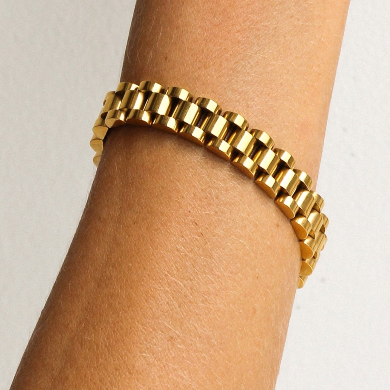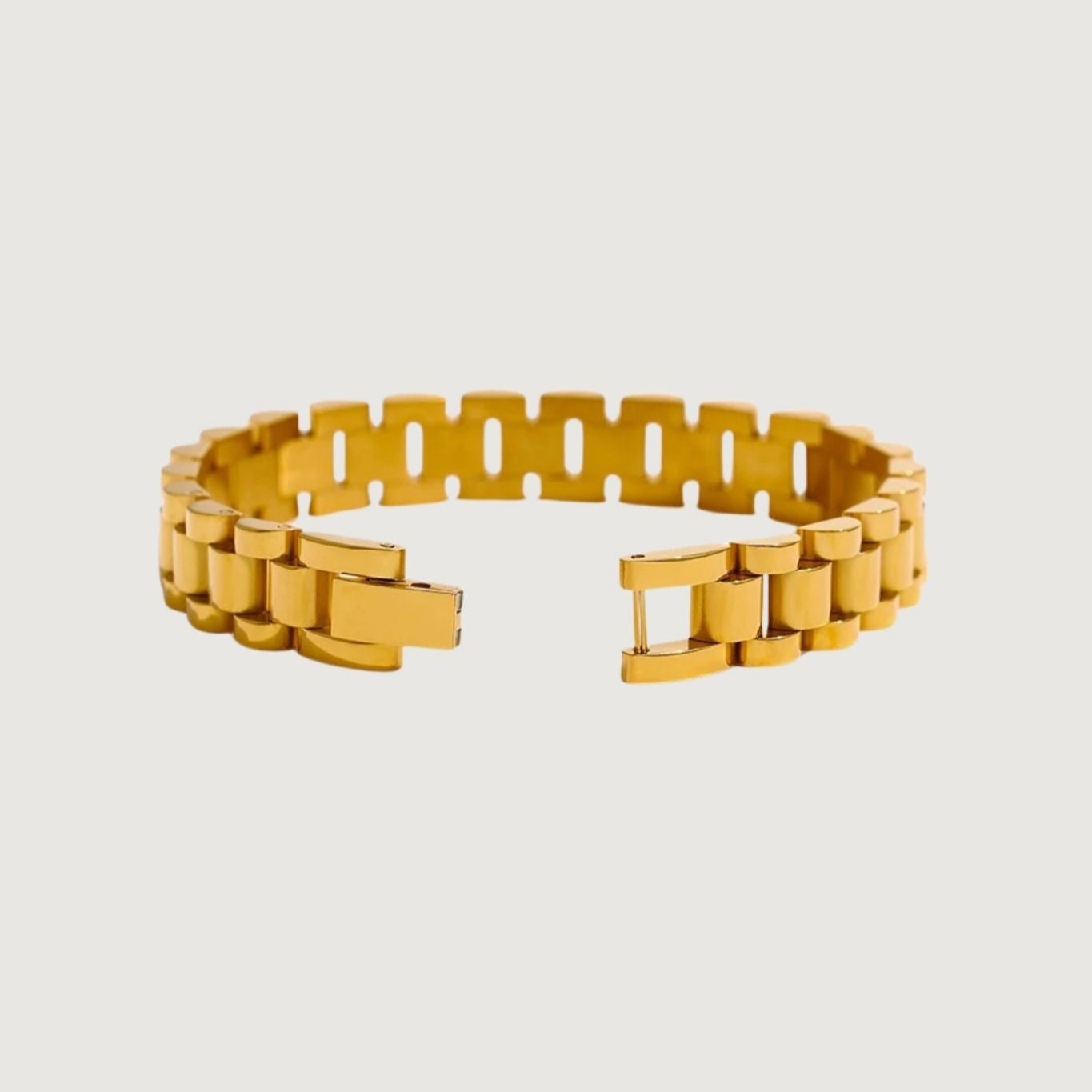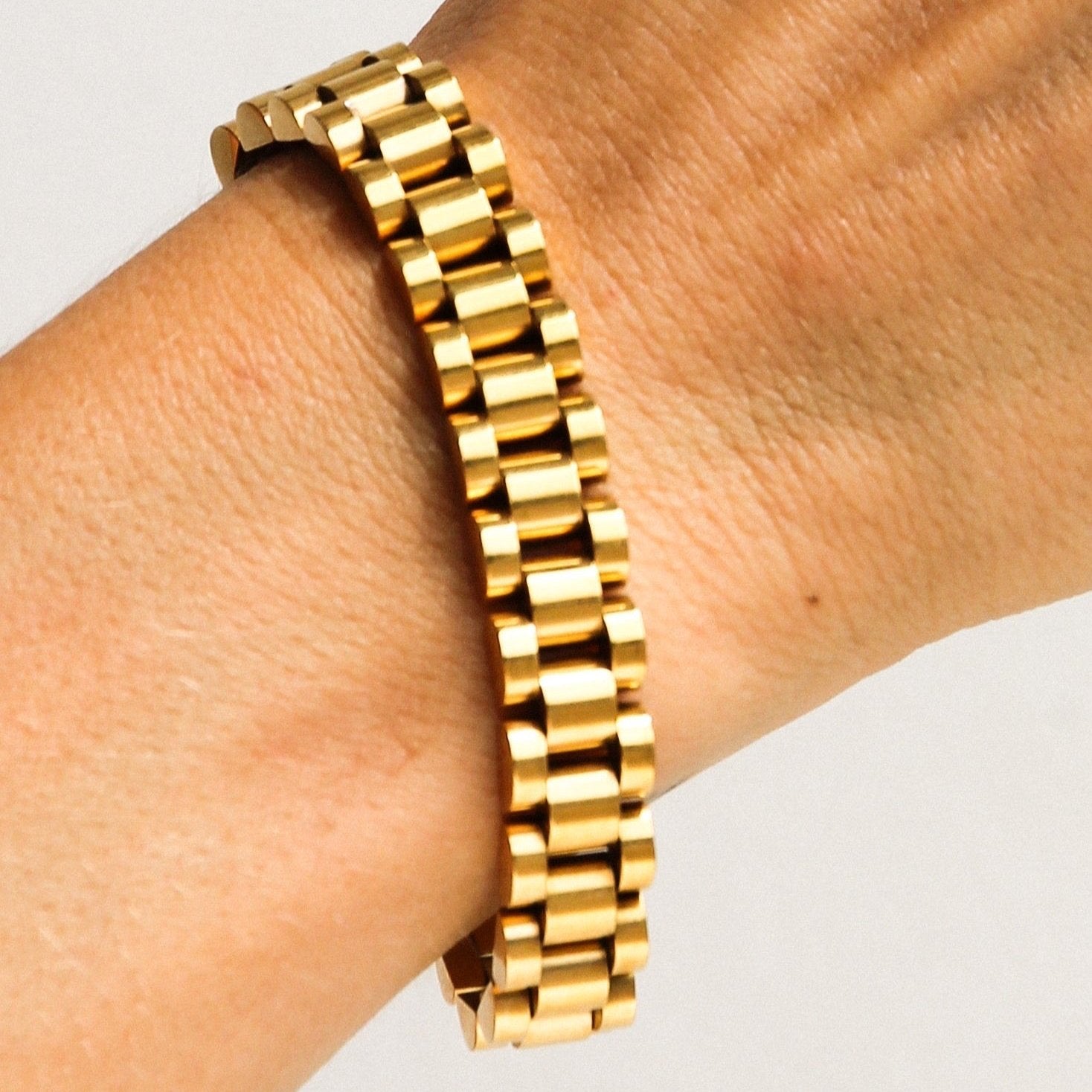 Using timeless materials, this 18 K gold-plated, stainless steel bracelet is an everyday luxury that is tarnish-free, waterproof and elegant. The timeless watch link design effortlessly elevates any look. Impress onlookers and show off your opulent charm with ease!