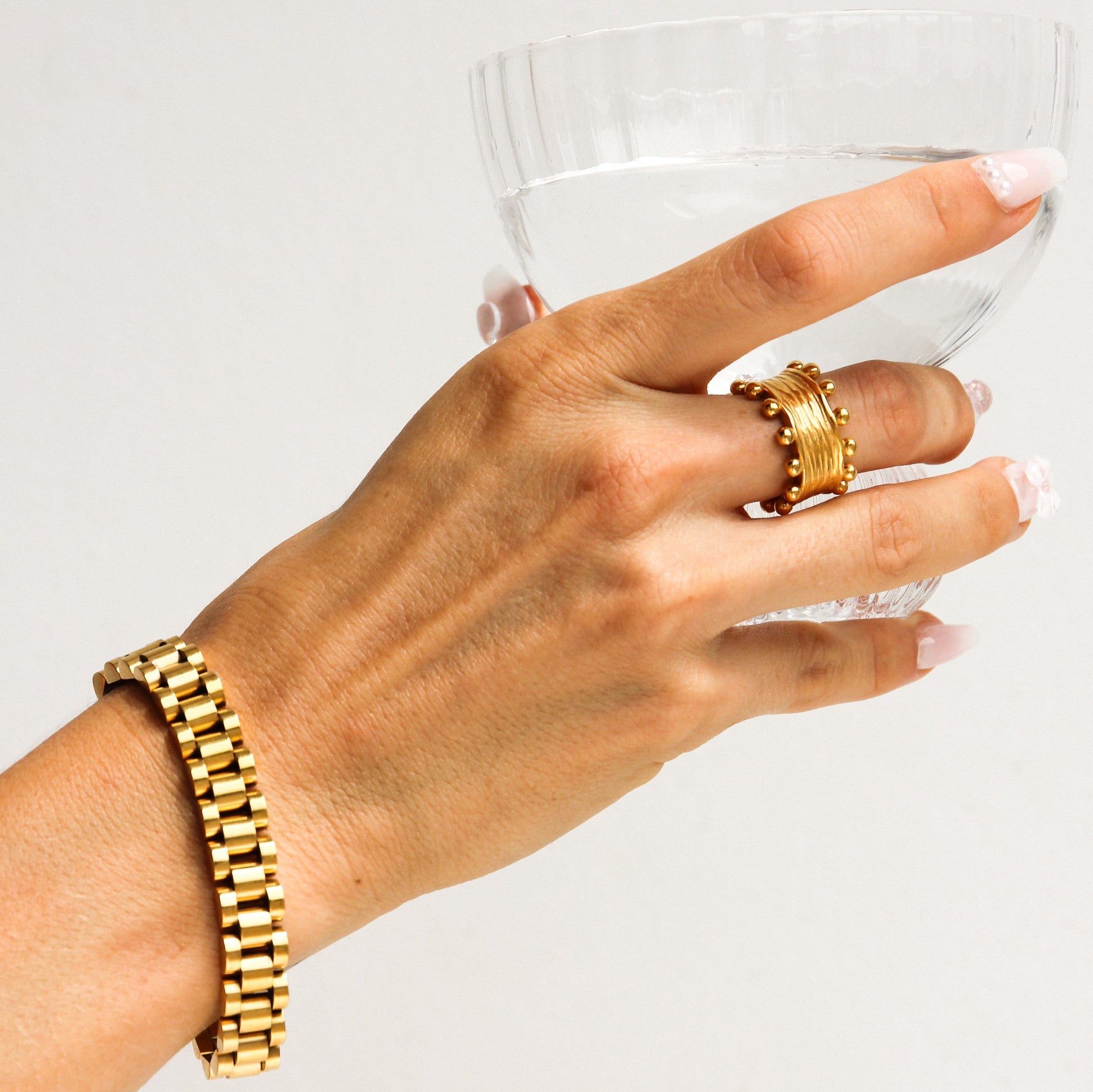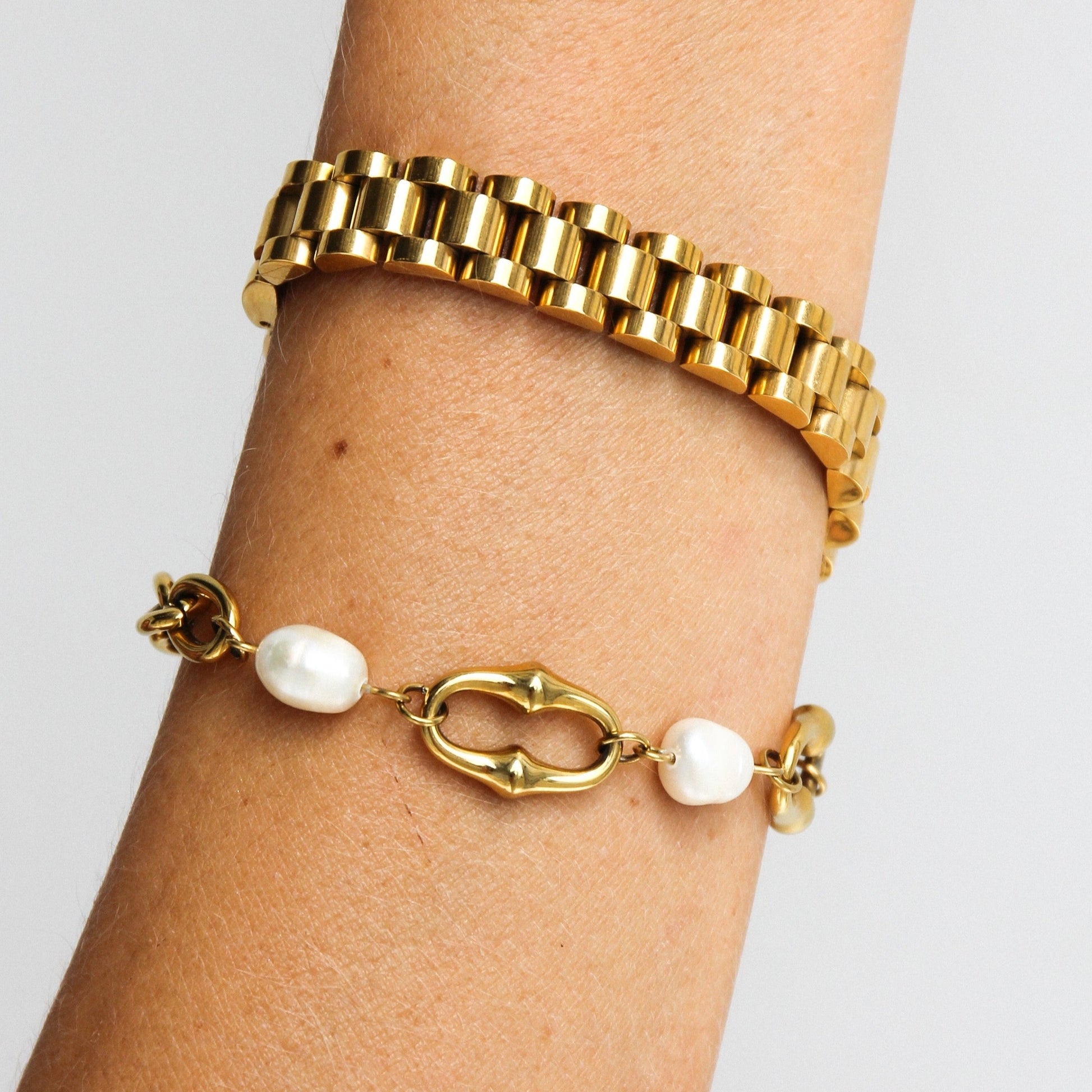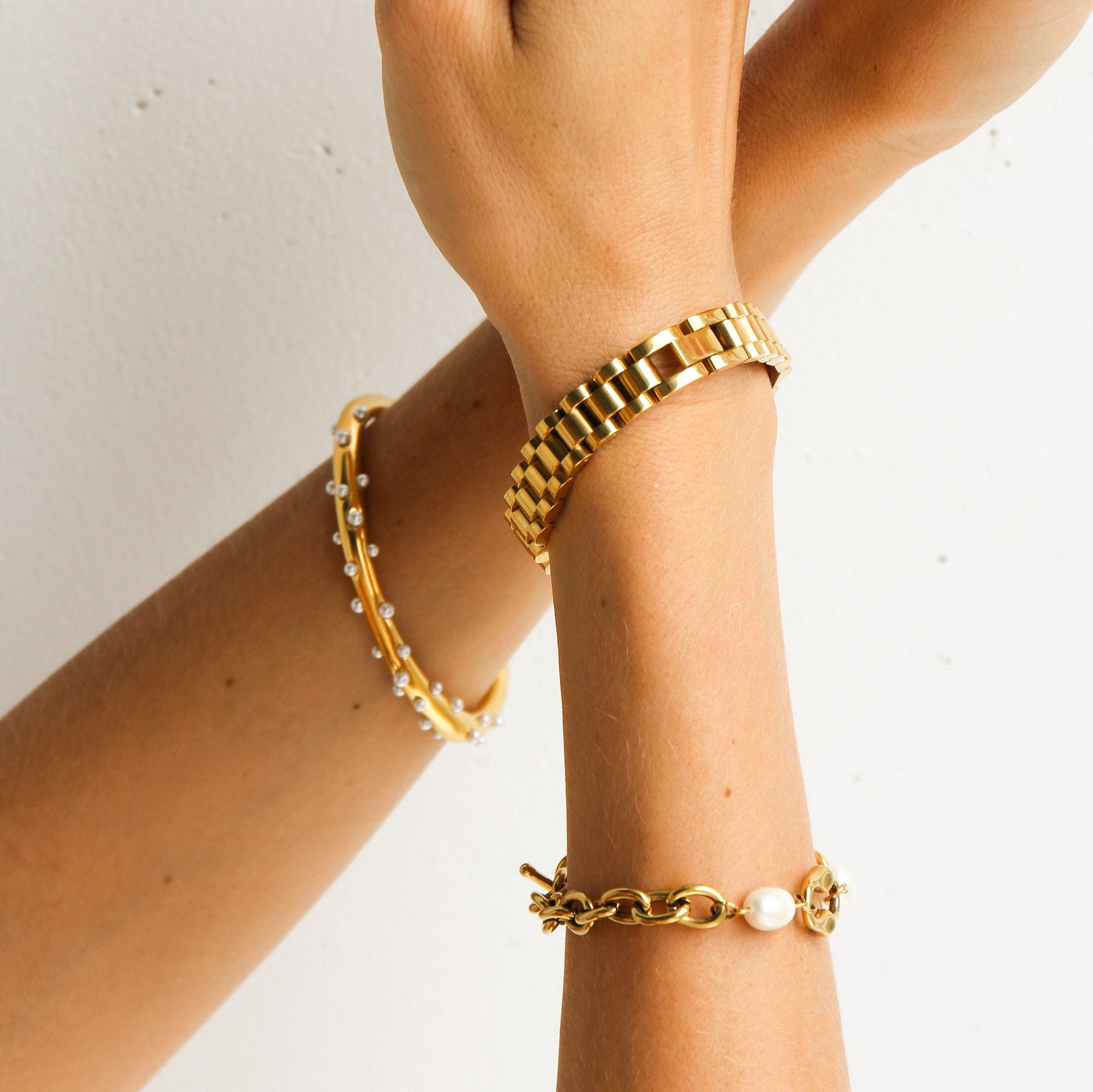 Using timeless materials, this 18 K gold-plated, stainless steel bracelet is an everyday luxury that is tarnish-free, waterproof and elegant. The timeless watch link design effortlessly elevates any look. Impress onlookers and show off your opulent charm with ease!