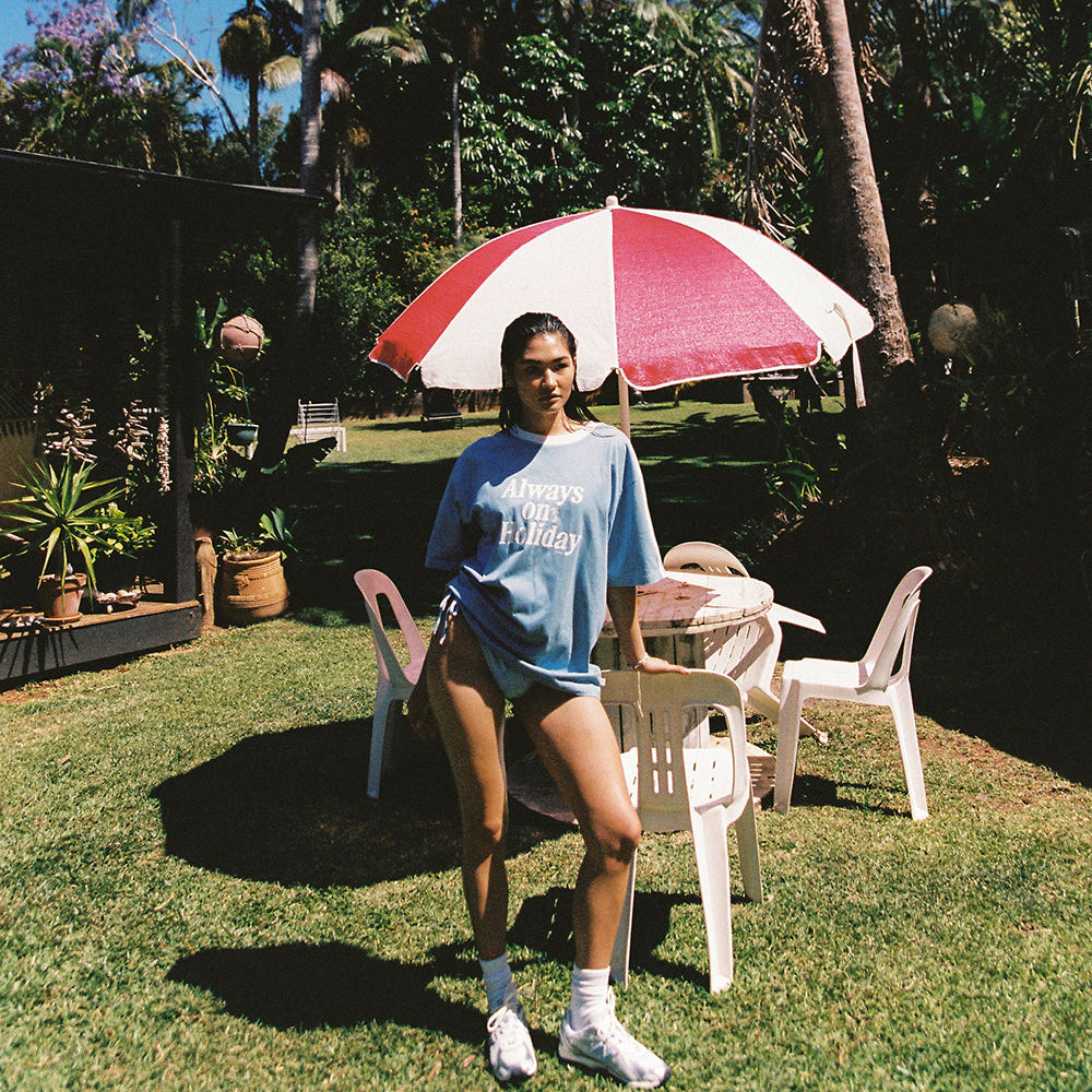 The Always On Holiday Tee says it all. Drenched in dusk blue with a crackle print finish, it’s an ode to carefree days and salty skin. Contrast rib and sleeve taping add a nostalgic hit — perfect for island hopping or slow mornings under the palms.