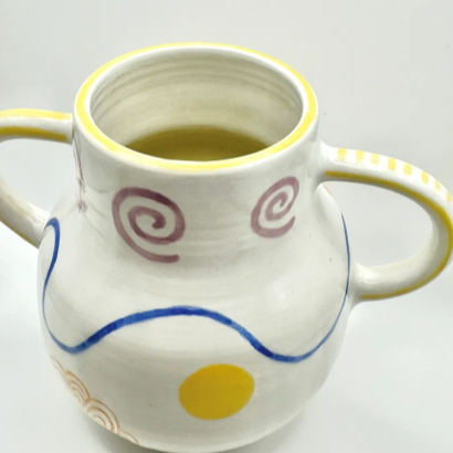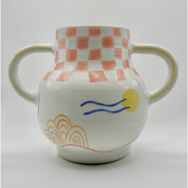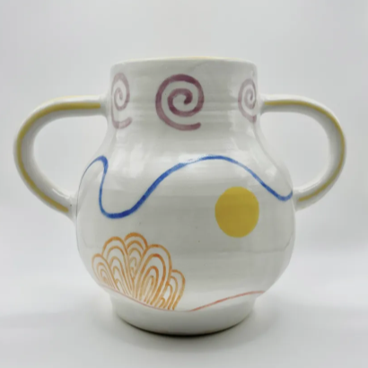 A solid built vase with wide handles. Nice piece for practical use or as an art piece/object to decorate your home. Take the SMELLS THE MAGIC vase home and you are guaranteed a happier space. She'll bring you good energy!