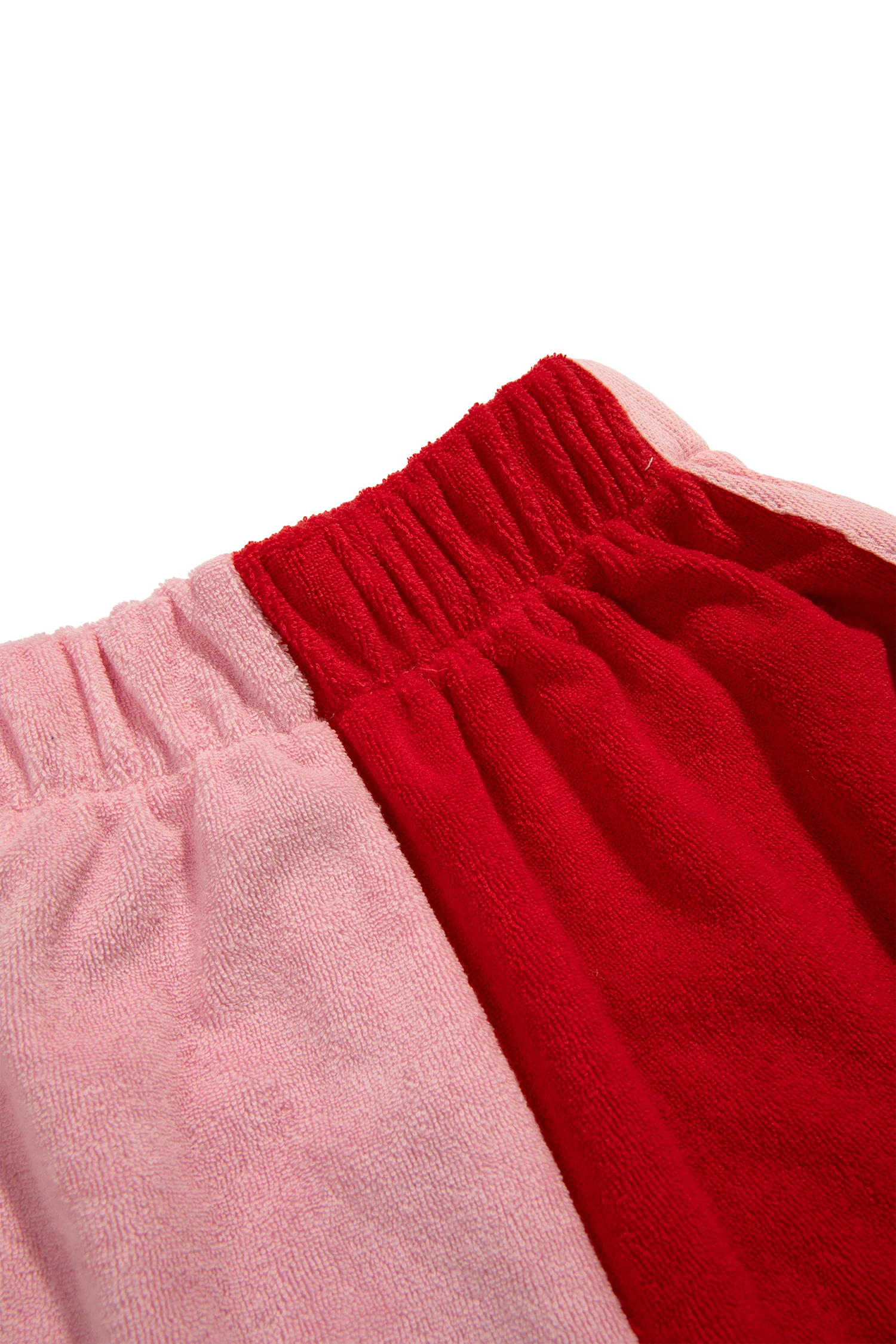 Made with 100% terry towelling fabric. A relaxed fit, with an elastic waistband for comfort. Featuring contrasting red and pink and contrasting piping down each side for a playful touch.