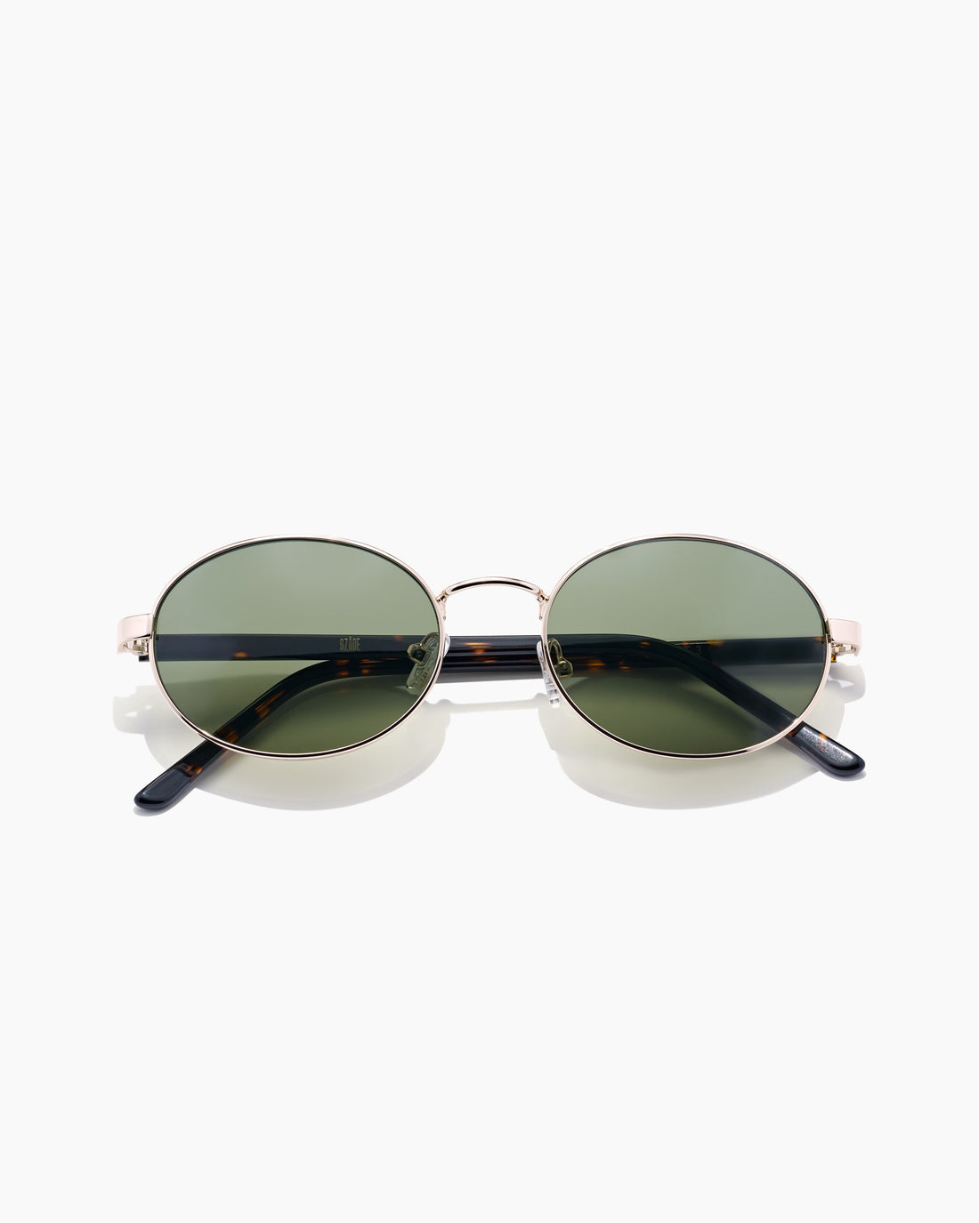 meet finch ; our newest oval frame from our luxe metal series. a timeless style that's always IN. with acetate temples and universally flattering round lenses this polished gold sunglass is a modern must have.