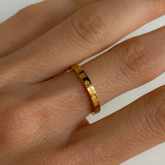Fall in love with the charming elegance of the EMBEDDED HEARTS STACKING RING. This delightful band is crafted from 316L stainless steel and coated in lustrous 18k gold PVD plating for a long-lasting shine. Featuring intricately embedded heart designs along the band, this ring offers a sweet and subtle way to add a touch of romance to your look.