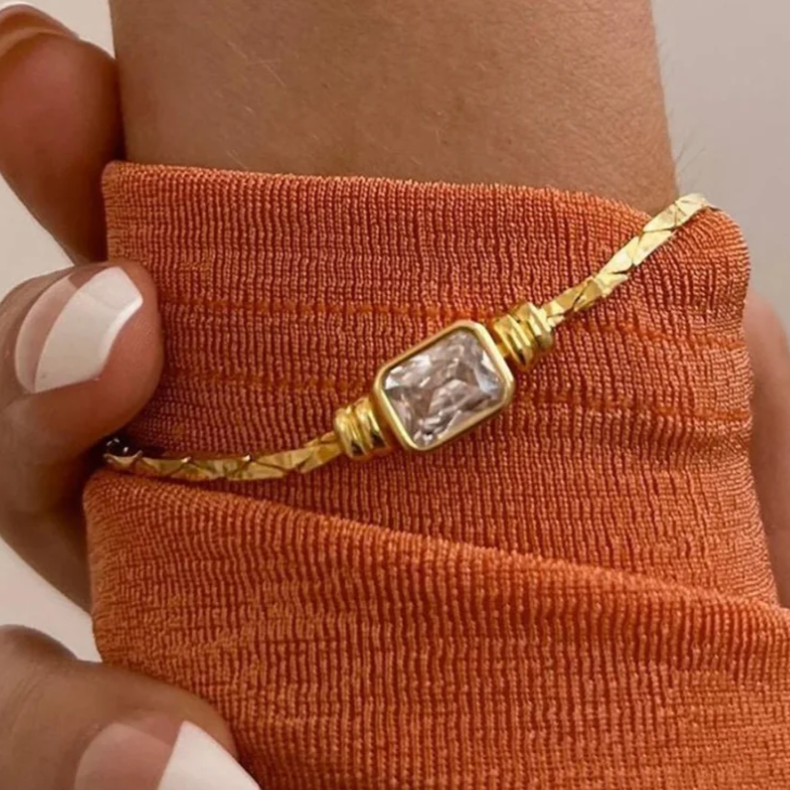 Complete your look with the GOLDEN GLOW BRACELET, a sleek, radiant accessory designed for those who love understated luxury. This bracelet features a stunning square-cut crystal pendant set in 18k gold PVD-plated stainless steel, providing a polished yet modern aesthetic. The intricate braided chain adds a delicate, feminine touch, making this piece perfect for layering with other bracelets or wearing solo for a minimalist statement.